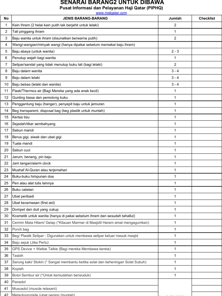 Senarai Semakan Barangan Keperluan Haji Umrah